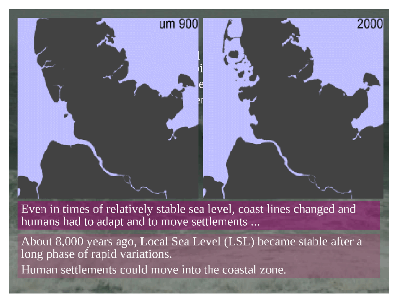 Even in the times of relatively stable sea level, coast lines kept shifting and settlements had to move along with the changing coast lines. The example shows the Danish coast around 900 and 2000. Large areas of the western part of what is today Denmark and Northern Germany has been inundated and partly eroded by the encroaching sea. Even today, coastal erosion is a serious problem in some of these (and other) coastal areas, threatening a lot of coastal high-value property. |