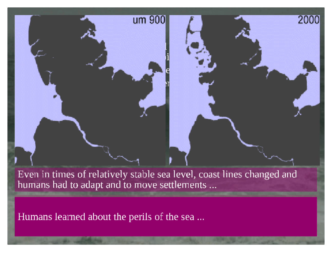 Even in the times of relatively stable sea level, coast lines kept shifting and settlements had to move along with the changing coast lines. The example shows the Danish coast around 900 and 2000. Large areas of the western part of what is today Denmark and Northern Germany has been inundated and partly eroded by the encroaching sea. Even today, coastal erosion is a serious problem in some of these (and other) coastal areas, threatening a lot of coastal high-value property. Remains of coastal infrastructure submerged today under sea level, or high above the present-day coast line demonstrate that settlements had to adapt to slow changes in LSL. Other indicators document major disasters caused by sea-level related hazards such as storm surges and tsunamis. In the course of settling in coastal areas, humans got acquainted to the perils of the sea. |