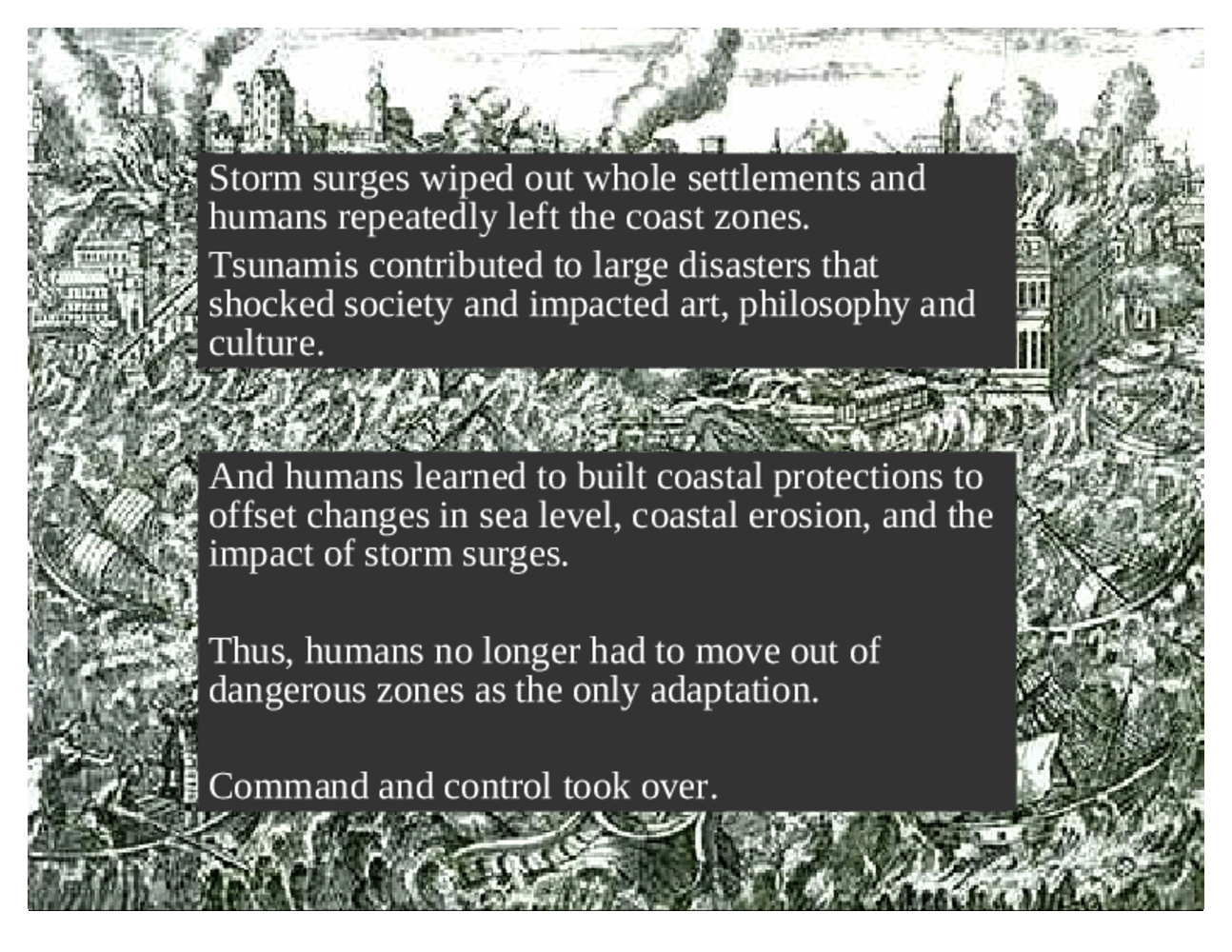 Over time, humans learned to built coastal protections that would offset changes in sea level, coastal erosion, and the impact of storm surges. Thus, humans no longer had to move out of the hazardous zones as the only option for adaptation. An area of command and control of the environment started: Humans developed skills in protecting coasts against the power of the sea, at least temporarily, and by that control the natural processes in the coastal zone. Settlements expanded in more and more hazardous areas prone to inundation and extreme flooding. |