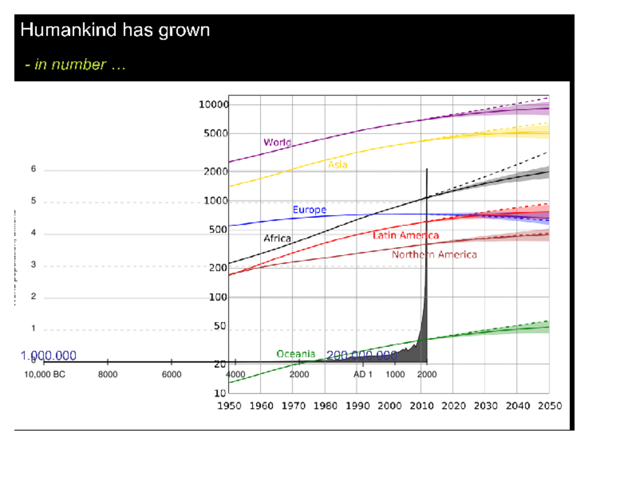 Humanity has grown in number tremendously. 10,000 years ago, at the end of the last ice age, we were an estimated one million. At the time of the Roman Empire we had grown to some two hundred million. At this size, we were already able to change Earth's surface significantly and, for example, deforest a large part of the Mediterranean coast hills and adjacent land areas. Today, with more 6 billion, we are more than thirty times as powerful, able to alter a large fraction of Earth's surface substantially. And we still continue to grow. Although in some continents population growth is zero or even slightly negative, in other continents population is growing at a high rate. |