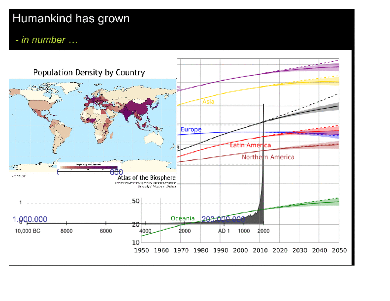 And Humanity is not distributed evenly over Earth's surface. While in some areas population density is as low as 1 person per square kilometer, in other areas density exceeds already today 500 people per square kilometer. Often, these high density is found in regions that already today cannot sustain the population with water, food, and other resources. |