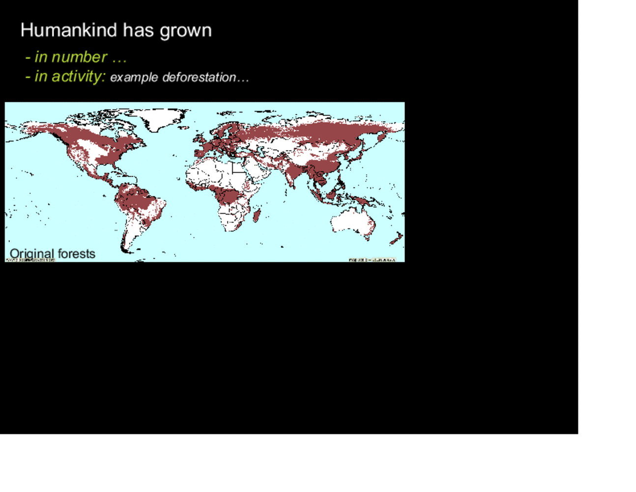 And humanity has grown in activity. An impressive example is deforestation. Once upon a time, Earth's surface to a large extent was covered by forrests, dense forests in many areas that it was difficult for humans to actually dwell in them. A hypothethese states that, for example, four thousand years ago, the British Isles were covered with a forrest so dense that humans moved along the coasts to the North but did not explore the interior. The map shows the extent of the original forrests. |