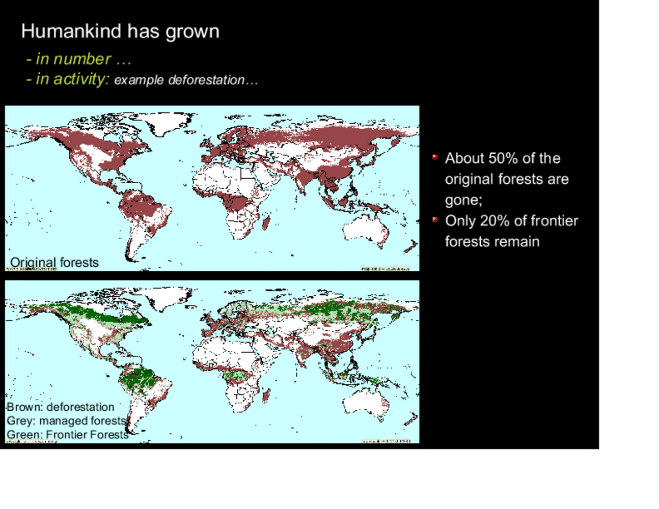 And humanity has grown in activity. An impressive example is deforestation. Once upon a time, Earth's surface to a large extent was covered by forrests, dense forests in many areas that it was difficult for humans to actually dwell in them. A hypothethese states that, for example, four thousand years ago, the British Isles were covered with a forrest so dense that humans moved alongun the coasts to the North but did not explore the interior. The map shows the extent of the original forrests. Today, large parts of the forrest are either gone and lost or heavily managed by humans. More than 50% of the forrest are gone (the brown areas in the lower left map) and the rest (shown in grey) are managed. Only 20% of the original forrest remain as what we call frontier forrest, and they are shown in green on the map. These frontier forrest are of very high value for the biosphere allowing for the undisturbed evolution of the ecosystems, but they are threatened by humanities pressure. |