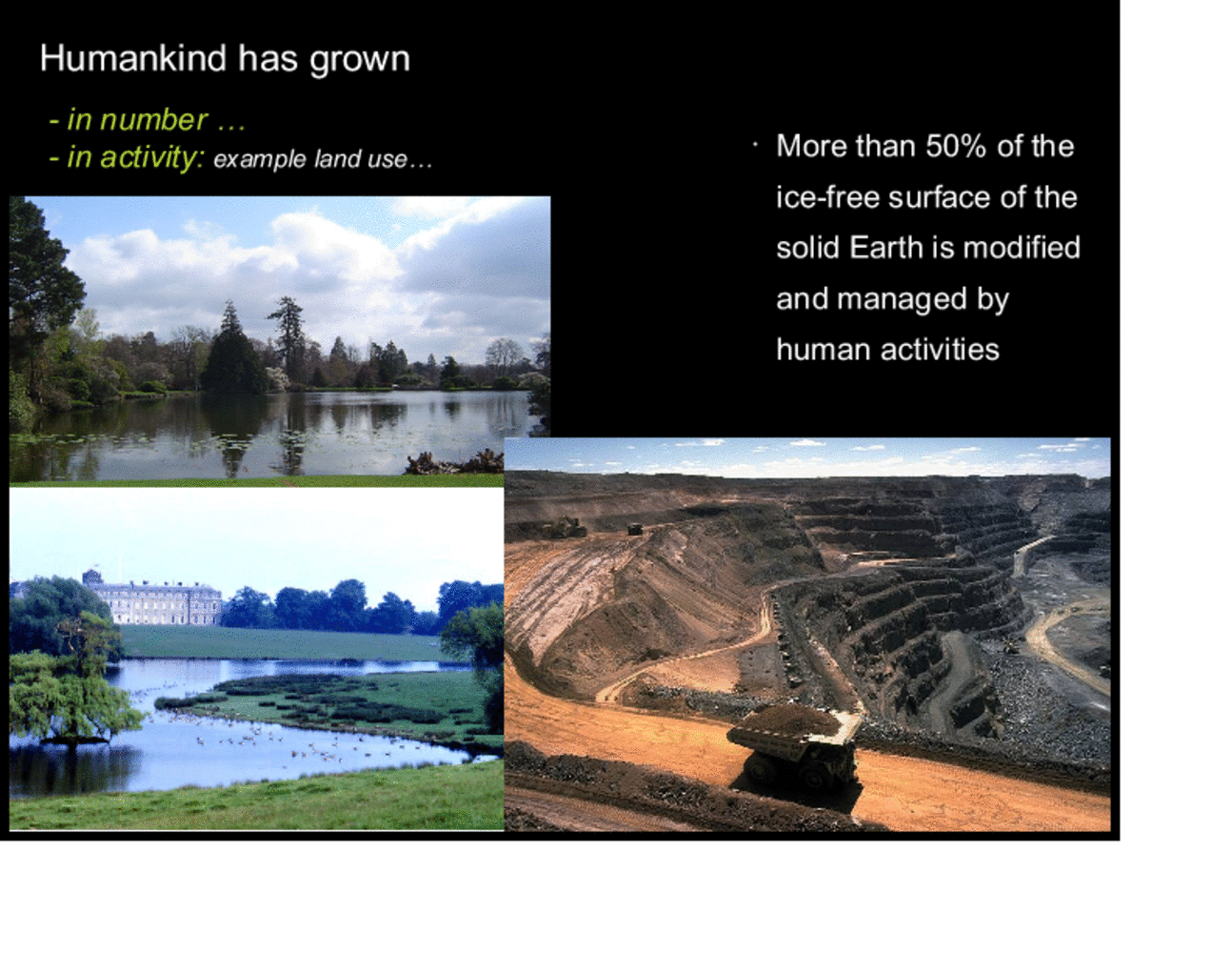 Another example is land use. We have created beautiful landscape, lucheous, tranquile landscape that please our soles and inspire our poems. Landscape that are rich ecosystems and refugees and island for many species. And we like to build our houses in managed and beautifully designed landscapes, although not all of us are able to have houses as big and beautiful as the one in the picture. But most of us like to have a small piece of land, even if it is just an urban frontyard, that we can put our very personal stamp on. We all feel like we need to impact our immediate environment. But we also have impacted the environment negatively, changed it into devastated, ugly, industrial, monotoneous spaces deserted of rich ecosystems and void of thriving live. Most importantly, humanity has modified, permanently changed, or managed more than 50% of the ice-free surface of the Earth's surface. We have grown to a major power able of transforming the Earth's surface substantially. No other species has ever been in this position. |