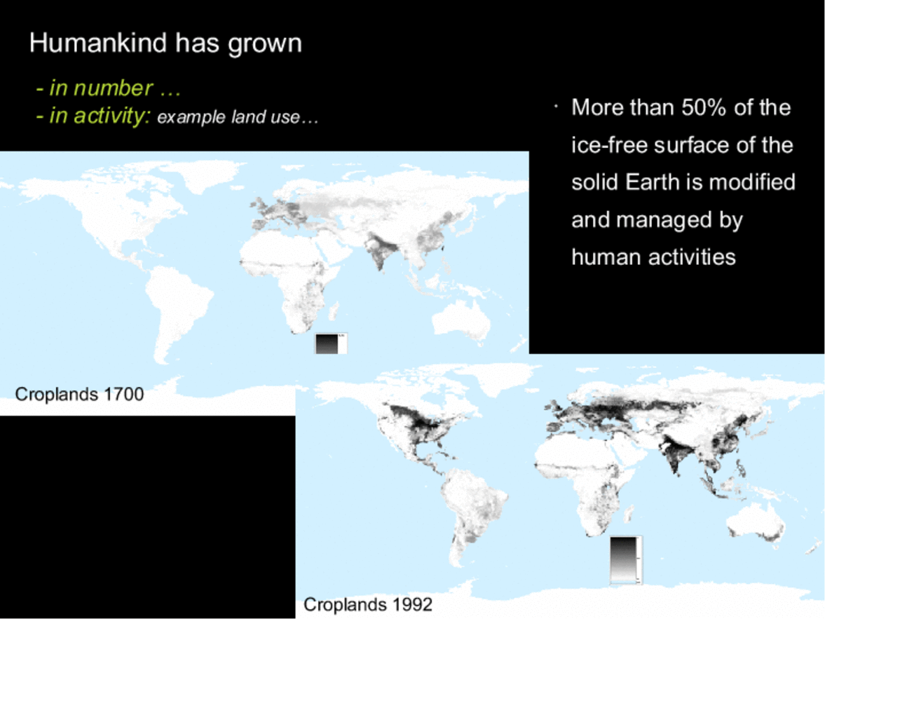 There are many examples that demonstrate the scale of our activities. One is the extent of croplands. Around 1700, croplands were basically limited to a few areas in Europe and Asia. Today, cropland have not only increased in global extent to North and South America and Australia, but also intensity, as is illustrated by the transition from light gray to dark grey and black in many areas all over the world. |