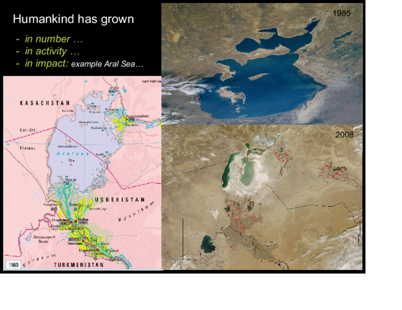 In the 1960ies and in many decades before, the Aral Sea in the former Soviet Union was a desert terminal lake of considerable extent (see the Aral Sea) with thriving fishery and healthy twons and cities at its shores. . Russian engineers, who thought that this lake was an error of nature, decided that the water from the two rivers ... and ... feeding the Lake from the South and Noth-East could be diverted to irrigate the desert in order to plant cotton for export. In 1986, the Lake had already started to shrink. The breaking up of the Soviet Union accelerated this process because now the emerging countries Kasachstan, Usbekistan, and Turkmenistan without much coordination increased the diversion of water. In 2008, the lake has shrunk to less than 25% of its original size, salinity has increased five-fold, fish died, and much of the former lake botton turned into dusty desert, freeing pesticide and nutrients stored in the lake during preceding decades. A major environmental developed rapidly with the economic basis for the adjacent settlements gone and the health of the population rapidly deteriorating due to the high air polution from the former lake bottom. |