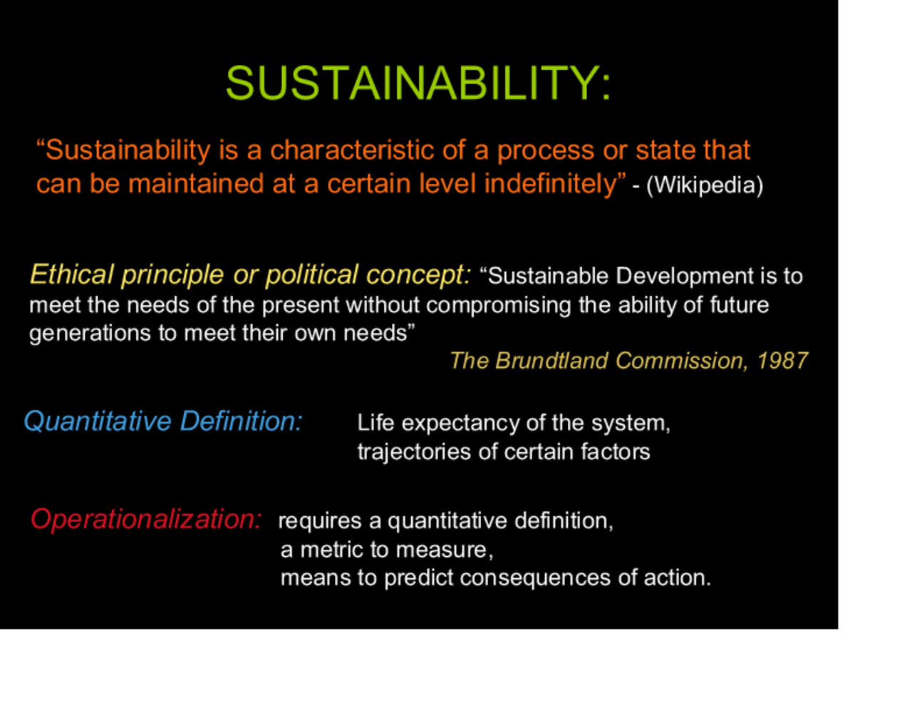 As defined in the report on ``Our Common Future'' prepared by the World Commission on Environment and Development, the Brundtland Commission, in 1987, Sustainable Development is to meet the needs of the present without compromising the ability of future generations to meet their own needs (..., 1987). By striving for sustainable development, we do not follow a natural law or try to be compliant to a given principle. Neither do we follow just a political concept, as sustainable development it is often described. In its broadest sense, sustainable development only makes sense as an ethical principle, as a basis and guidance for the choices we have to make. Adhering to the principle, we make the choice to meet our needs, not just the material ones, without compromising the ability of our kids to meet their own needs, not even knowing what their needs will be. This principle applies not only to the needs of future generations: adhering to the principle, we make the choice to meet our needs without compromising the ability of our contemporaries to meet their needs. In this sense, again the future is now. |