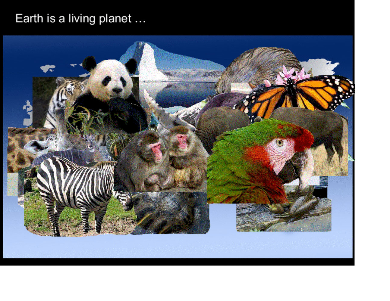 Over its existence, Earth has developed a rich biosphere with a large and still unknown number of species, which occupies more than ... orders of magnitudes from small microbes to whales, and which has adopted to nearly all environments on Earth from ice to submarine volcanoes. Microbes, reptiles, insects, birds, mammals, together form a rich variety of ecosystems that turn Earth's surface into a highly variable mosaic of small but interconnected patches depending on available energy, nutrients and links to other ecosystems. |
